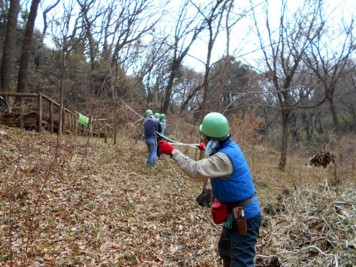 そこで、伐採した材をロープで引っ張って、引きずり下ろすことにしました。