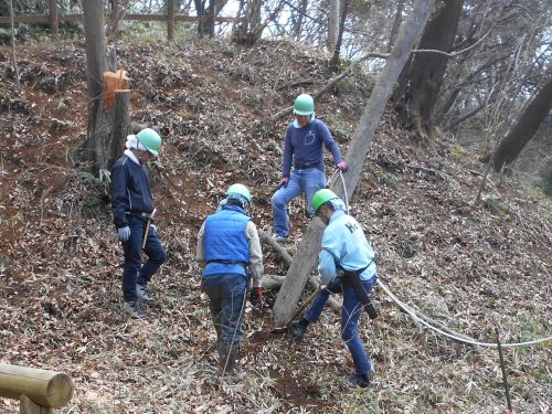 上方はサクラの枝につかまり、下方は穴の中で別の木の根につかまっていてどうすれば良いのか分からなくなりました。 先ずは、かけてあったロープをそのまま引っ張って倒せるかどうか試してみましたが、倒れませんでした。 下の方は深く潜っているようだったので、スコップを持ってきて、引っ張り出せるように掘ってみました。 すると、太い木の根に挟まれていることが分かりましたので、その根を伐って、根本側にロープをかけて、引っ張ってみましたが、この人数ではどうにもなりませんでした。