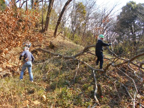 この伐り折る作業ができたら、上方の枝の絡み合いも解けて、倒すことができましたので、材の片付けを行って、今回の活動を何とか終えることができました。 枯葉をつけたクヌギの萌芽枝は、1998 年末に国庫補助事業で萌芽更新地区づくりで伐採した時に補植したクヌギで、改めての萌芽更新地区づくりのための活動の中で、 2 年前に伐採したものです。