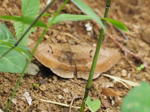 アズマネザサの新稈が 30cm ほどに伸びている開けた場所で活動していたら、大きな薄茶色の蛾が飛び出して、アズマネザサの間の地面に降りました。観察したところ、オスグロトモエのようでした。