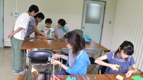| 第 4 回里山倶楽部A (七夕飾りづくりと萌芽更新地区のアズマネザサ刈り) 日時 2019年 7月 6日(土) 10:00〜15:00 場所 生田緑地 市民活動室、萌芽更新地区 参加者 6年目 山下まい、ねのは(小6) 4年目 池上幸一、豪一郎(小3) 2年目 小野寺まなみ、柚月(中1) 佐藤奈緒、天音(小4) 山本栄行、優真(幼児)、環希(幼児) (かわさき自然調査団市民部会事務局)岩田臣生、岩田芳美 13 名 7 月の里山倶楽部Aは、午前中は七夕飾りづくり、午後は萌芽更新地区のアズマネザサ刈りを行いました。