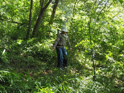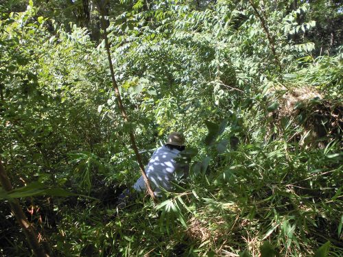 萌芽更新地区は高木層のクヌギの伐採を終えたところですから、木陰は少なくなっています。 それでも、萌芽株や低木の繁っている下に木陰ができているので、そんな場所のアズマネザサだけを刈ってくれるようにお願いしました。 その代わり、活動の様子を撮影することは難しくなりました。