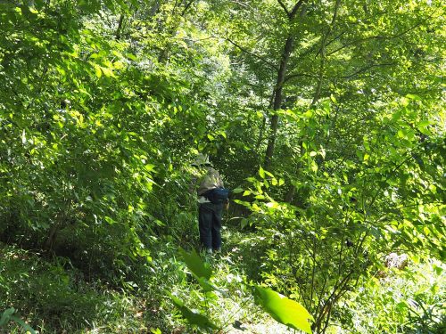 午後も、木陰中心にアズマネザサ刈りを続けましたが、暑さが辛く感じるようになったので、この日の活動を終わりにしました。 林内の小さなイヌザンショウにアゲハチョウが飛んで来ていました。