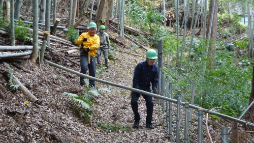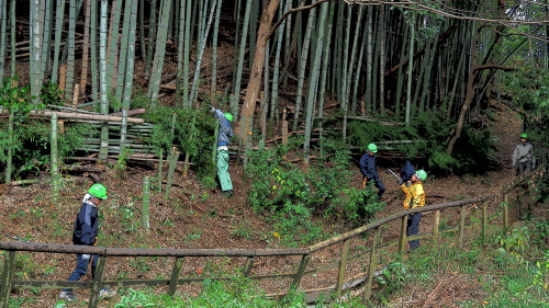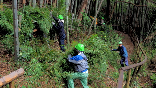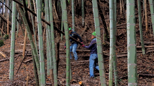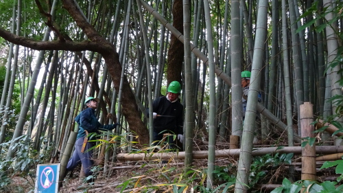 竹林内部の枯れたモウソウチクの除伐 この谷戸の竹林は隣接する住宅地の照明の光が谷戸に入ることを少しでも遮るため、また、モウソウチクを材として利用するための二つの目的で、竹林として残しています。 竹林内部の枯れ竹の除伐は、普段はデスクワークに追われている二人に任せました。 竹林は、枯れていたモウソウチクを除伐することで、汚らしい感じは無くなりました。