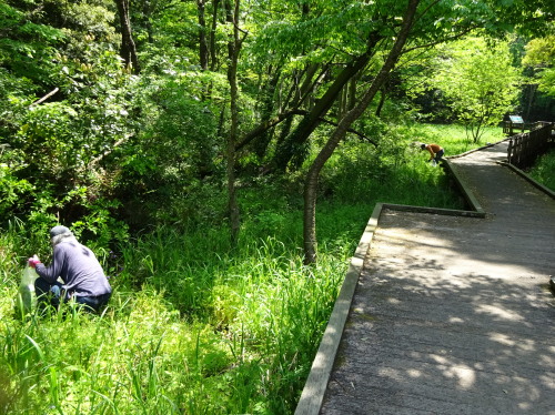湿地地区 解散した後に湿地地区に寄りました。 ハンノキ林からの流れの途中に大きな水漏れ穴が開いていて、湿地 2 段目が涸れていましたので、素手でできる範囲の補修を行いました。 また、セリバヒエンソウを見つけて駆除しました。