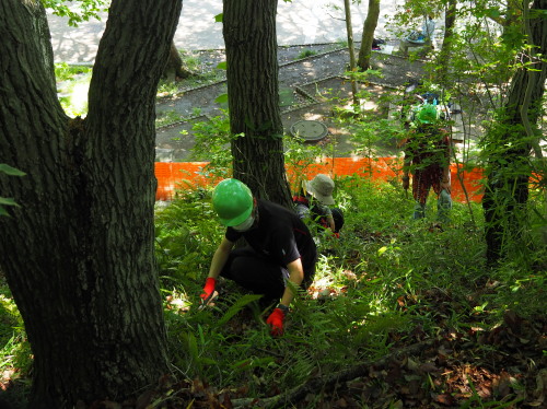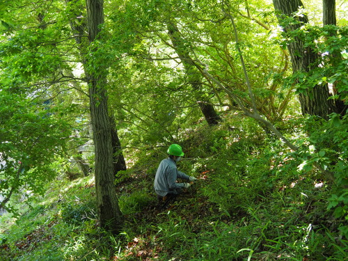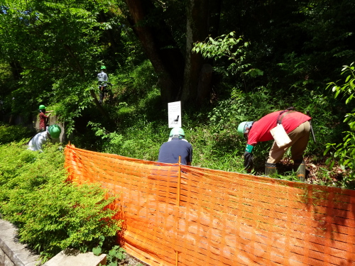 日時 2020年 5月 17日(日) 10:00〜13:00 場所 生田緑地 中央広場北雑木林 A26 参加者 東 陽一、岩渕裕輝、加登勇司、北川英樹、清田陽助、長澤正広、山本栄行、吉澤正一 倉本 宣、佐藤奈緒、南部輝久、山根将聖(高3)、和田 歩 (かわさき自然調査団市民部会事務局)岩田臣生、岩田芳美 15 名 第 4 回里山倶楽部は、中央広場北雑木林のアズマネザサ刈りを行いました。 当該地区については、2011/5/21(土) に、里山倶楽部を開催し、現地で植生管理について話し合いました。(参加者 9 名) この時期は、中央広場改修工事(2010年5月〜2012年3月)が始まった時でしたので、里山をテーマに草地広場に改修された中央広場に来園した市民に、適度に管理された雑木林を見てもらい、 生田緑地の自然のファンを増やしたいと考えて、植生管理を行うことを決めて、その年の夏に、行政が業者によるアズマネザサ刈りを行いました。 2011/12/17(土) 里山倶楽部)竹や常緑樹の除伐 参加者 13 名 2012/10/20(土) 里山倶楽部)アズマネザサ刈り 参加者 15 名 2014/3/15(土) 水田ビオトープ班)アズマネザサ刈り 参加者 5 名 2015/2/7(土) 水田ビオトープ班)アズマネザサ刈り 参加者 8 名 2015/2/10(火) 水田ビオトープ班)アズマネザサ刈り 参加者 4 名 2015/9/19(土) 里山倶楽部)アズマネザサ刈り 参加者 10 名 2017/4/15(土) 里山倶楽部)アズマネザサ刈り 参加者 11 名 2018/7/21(土) 里山倶楽部)アズマネザサ刈り 参加者 8 名 2019/11/16(土) 里山倶楽部)アズマネザサ刈り 参加者 8 名 里山倶楽部の活動参加については、公共交通機関を使わないでアクセスできることとしていましたが、緊急事態宣言においても要求していないことであり、 土日の電車は空いているから、乗車することで感染する可能性は低いと判断して、今回から、電車で来園して参加することを認めることにしました。 5/16(土) が雨の予報だったため、翌日に延期したのですが、電車を使って良いのならと、子どもの参加不可にも拘らず、大勢の参加がありました。 集合は、生田緑地整備事務所裏の倉庫前とし、手を洗い、ヘルメットを被り、必要な用具を持って、中央広場北雑木林下に移動してから、改めて自己紹介を行いました。 今回は、初参加の高校 3 年生、明治大学の倉本教授、里山倶楽部A参加者のお母さん、里山ボランティアとは縁の無さそうな男性など、 最近の常連メンバー以外の参加者がいましたので、初めの自己紹介程度は必要と考えました。 生田緑地は、新型コロナウイルス感染対策として、博物館施設、ビジターセンターなどが休館し、駐車場や広場も閉鎖されています。 それにも拘らず、生田緑地の来園者は多くなっていて、中央広場に面したこの雑木林には立ち入る来園者がいたのかも知れません。 生田緑地では、園路・広場以外の自然のエリアは立入禁止なのですが、自然の保全とルールを守らない人の安全のために、ネット・フェンスを張ったようです。 この日は、好天に誘われてか、来園者は多く、混雑していました。