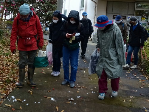 今回は生憎、霧雨が降っていましたが、それにも拘らず集まってくれましたので、10 時からは曇という天気予報を信じて活動を始め、様子をみることにしました。 生田緑地整備事務所前のアプローチの上に、小さな野鳥の羽が散乱していました。 事務所の車の出入りのためだろうと思いますが、羽は 10m程の範囲に広がっていました。 オオタカなどの猛禽がキジバトなどを捕食したのかと、根拠のない想像をしていました。