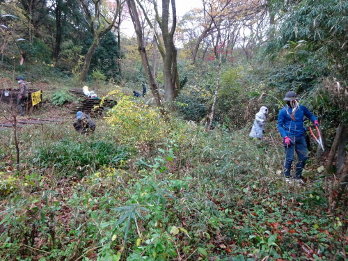 谷戸に降りました。 活動は、ピクニック広場の先からハンノキ林上のデッキ辺りまでの範囲に散って、園路沿いのアズマネザサなどを刈ることとしました。 エノキの大木があるので、至る所に、エノキの黒い実が落ちていました。