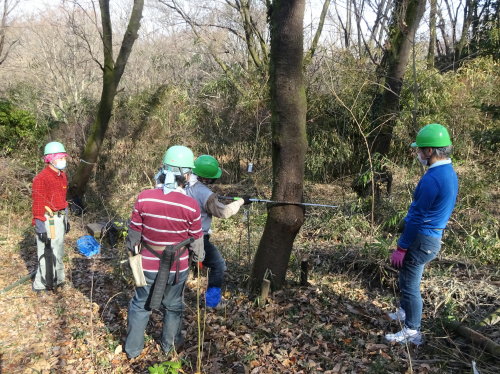 | 第 17 回里山倶楽部 <芝生広場上雑木林の樹木伐採(6)とアズマネザサ刈り> 日時 2021年 1月16日(土) 10:00〜13:30 場所 生田緑地 芝生広場上雑木林 A09-8 参加者(樹木伐倒チーム) 4名 6 年目 東 陽一、岩渕裕輝 5 年目 北川英樹 1 年目 伊澤高行 参加者(アズマネザサ刈りチーム) 2名 3 年目 中村瑞希、中村さち(幼児) (かわさき自然調査団市民部会事務局)岩田臣生、岩田芳美 計 8 名 里山倶楽部は、現在、芝生広場上雑木林の伐採更新に取り組んでいて、昨年度末は、長期間放置されていたアズマネザサ刈りを行い、今年度は、大径木の伐採を始めました。 直径 30cm、樹高 15mを超える樹木の伐採は、市民活動としては危険な活動です。 ただ、萌芽更新地区の伐採更新を経験してきたので、この地形で、私たちなりのスロー・ペースであれば、自然を楽しみながらの伐採更新が可能だろうと考えて活動しています。 生田緑地整備事務所裏の倉庫前に集合して、ヘルメットを着用し、ノコギリなどを持って、芝生広場上雑木林に移動しました。