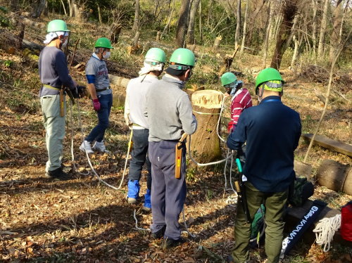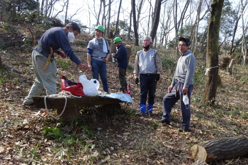 | 第 20 回里山倶楽部 <芝生広場上雑木林の樹木伐採(9)> 日時 2021年 2月 13日(土) 10:00〜13:30 場所 生田緑地 芝生広場上雑木林 A09-8 参加者(樹木伐倒チーム) 5名 6 年目 東 陽一、岩渕裕輝 5 年目 北川英樹、吉澤正一 1 年目 伊澤高行 (かわさき自然調査団市民部会事務局)岩田臣生、岩田芳美 計 7 名 今回は、アズマネザサ刈りチームの活動はありません。 活動開始は、ロープの結び方の講習としました。 大径木の伐採に必要なロープワークを全員ができるようにしたいと思います。