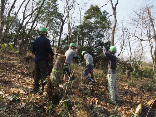カタナボーイ 650 を 2本にしたので、後半は、2 チームに分かれて、コナラ 2 本を伐採しました。 伐倒方向を考えて、面倒でも、ロープを張って、引き倒す練習も行いました。 コナラ(イ)伐採