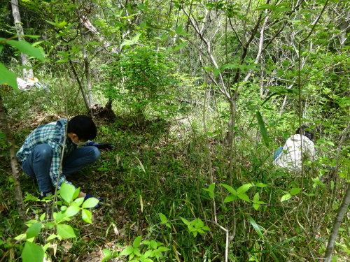 <皆伐更新地区のアズマネザサ刈り> 日時 2021年 4月 3日(土) 10:00〜12:00 場所 生田緑地 皆伐更新地区 A14 参加者(アズマネザサ刈りチーム) 18 名 佐藤登喜子 5 年目 池上幸一、陽子、豪一郎(小5) 新井みどり 3 年目 山本栄行、優真(幼児)、環希(幼児) 佐藤奈緒 2 年目 中村瑞希、さち(幼児) 佐藤優子、功一(中3) 1 年目 滝島麻由、一加(中3)、啓矢(小6)、沙奈(小5) 事務局 岩田芳美 皆伐更新地区は、2010年末に皆伐して、翌年から、自然に発芽した実生を育てて、若いコナラ林をつくるという活動を行い、2018年夏には目的を達成できたことを確認しました。 この活動は、4〜12 月の毎月、里山倶楽部 A という名称で、お母さんと子どもたちに、パイオニア樹木の抜取、アズマネザサ刈りを実施してもらうことで達成できました。 樹林が形成できたことは、アズマネザサの繁茂が止まることで、素人にも判断できて、林床のアズマネザサも年 1 回としました。 しかし、初めての皆伐更新実験ですので、状態を観察して、必要と思うことがあれば手入れをしたいと考えて、アズマネザサ刈りを行うことにしました。 アズマネザサ刈りの参加者は 18 名と多かったので、手慣れた参加者には、外縁部のヤブ状態のアズマネザサを刈ってもらいました。 皆伐時に見つけて、皆伐更新の過程で消えると思っていたシュンランが無事に生き残っていることを確認しました。