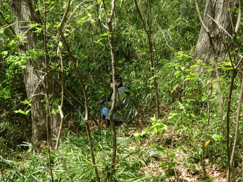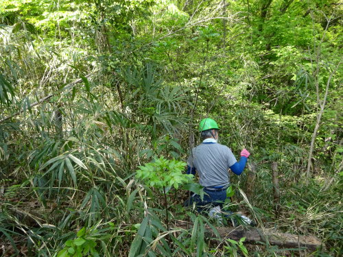 <皆伐更新地区下地区のモウソウチク除伐> 日時 2021年 4月 3日(土) 10:00〜13:00 場所 生田緑地 芝生広場上雑木林 A14 参加者(モウソウチク除伐) 5 名 6 年目 東 陽一 4 年目 北川英樹、加登勇司 1 年目 伊澤高行 事務局 岩田臣生 皆伐更新地区下に侵入したモウソウチクの除伐は、皆伐更新実験を進めて、実生が育ち始めた 2014 から始めた活動です。 里山倶楽部として、この活動から、ヘルメットを必要とする活動も行うようになりました。 昨年 5/7 に、水田ビオトープ班として、枝葉を広げる前のモウソウチクを除伐しする活動を行いましたが、この効果は大きく、1 年間経ったのに、モウソウチクが増えていないと感じました。 今年も、5 月になってから、伸びきったタケノコを切り倒す活動を行うべきと実感しました。 皆伐更新地区下のアズマネザサの繁茂は著しく、ヤブの中を泳いで、モウソウチクに辿り着くのは容易ではありません。 桑切鎌を持たずに入っているのに、アズマネザサ刈りを進めている参加者もいました。 私自身は、常に、桑切鎌、剪定鋏、ノコギリを携帯していますが、それは、手製の桑切鎌携帯用の袋があるから可能なので、この袋が無ければ、ヤブの中の作業で、桑切鎌を失くすことになります 次回は、基本をアズマネザサ刈りにして、モウソウチクを除伐する時のために、ノコギリも携帯しておいてもらえば良いと思います。 皆伐更新地区と皆伐更新地区下の間のアズマネザサ刈りを進めたいと思います。