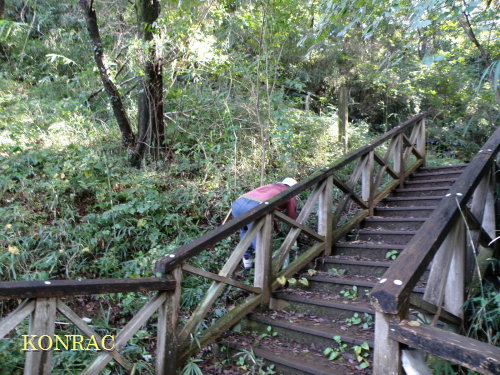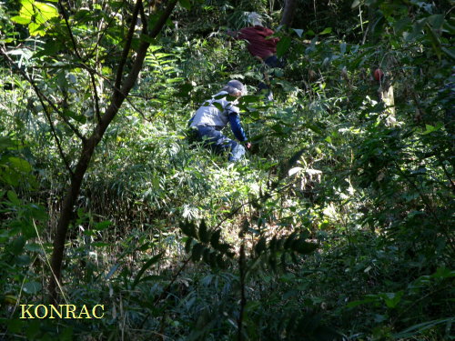 萌芽枝を覆っていたツル性植物(カラスウリが朱い実をつけていました。)を除去したり、大きく茂った低木(ムラサキシキブ、サンショウ、ヤマグワなど)を適当な高さで伐採したり、 萌芽株近くについては、ハリギリなどの高木種でも、低い高さで伐採したりしました。 こうすることで、樹間に光や風が入るようになりました。