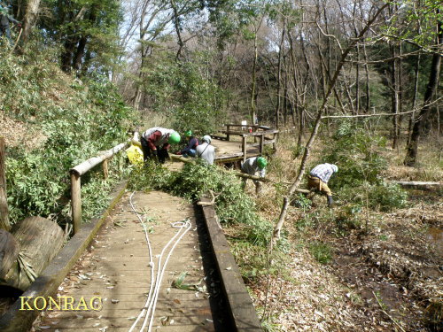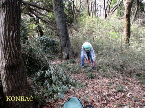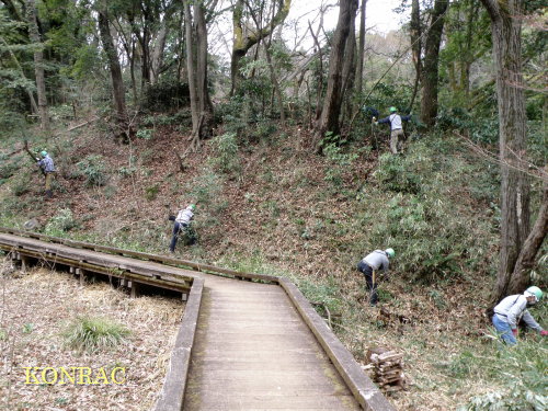 令和 3 年度第 29 回里山倶楽部 <ハンノキ林西地区の皆伐更新に向けた活動(2)> 日時 2022年 3月19(土) 10:00〜13:30 場所 生田緑地 ハンノキ林西地区(A07-12) 参加者 伊澤高行、加登勇司、北川英樹、吉澤正一 佐藤優子、佐藤功一(中3) (事務局)岩田臣生、岩田芳美・・・8名 一昨年の秋から今年 1月15日までの里山倶楽部では、芝生広場上雑木林の伐採更新のための大径木伐採を行いました。 また、昨年夏期には、飯室山南地区アズマネザサのヤブを刈り、皆伐更新地区東南隣接地のコナラ大径木を露わにし、1月以降、これら胸高直径 50cmもの枯れコナラを伐採し、 皆伐更新地区の拡大を始めました。 皆伐更新地区は、自然に発芽したコナラ、ヤマザクラなどの樹木を育てて、11年が経過し、コナラ若齢林と言える雑木林になっているので、 充分な日照を得られるように、南側の樹高20mもありそうな大木は無い方が良いという考えもありました。 里山倶楽部は、普通の市民がレクリエーションとして参加できる活動として企画していますので、 直径 50cmもの大木をノコギリで伐採するという危険な活動は避けるべきかも知れませんが、この特別な体験は参加者の自信にもなっていると思います。 このエネルギーを活かして、中央地区北側の谷戸の雑木林を魅力的な状態に保全したいと考え、そのための方策を検討する活動も行うことにしました。 2月からは、ハンノキ林周辺の雑木林を調べる活動を始めました。 今回は、前回に続いて、ハンノキ林西地区の常緑小径木伐採を行って、目標を考えました。 伐採対象の大部分は木道沿いの斜面にありますので、活動中は、コーンバーによって、この部分の木道を通行禁止にしてもらいました。 今回は活動前に、活動についての注意を行い、また、林床に生えている草本などについての説明を行いました。