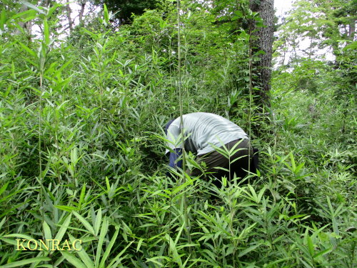 7/23〜8/7頃を二十四節気では、大暑といい、最も暑さが厳しく感じられる頃ということです。 実際、朝から暑かったのですが、夏の芝生広場上雑木林を観察して、育ち始めたコナラの実生などの周りのアズマネザサ刈りを、少しだけ行うことにしました。 芝生広場上雑木林は、すっかり、1mほどの高さにアズマネザサが繁茂し、ヤマイモの仲間など、ツル植物が伸びていて、区域に入って歩く足を捕られました。 伐採したキリからは萌芽枝が成長し、樹高は 8mほどになって、存在感を誇示していました。