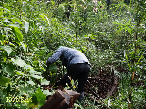 実際に始めてみると、直径1〜2cmのアズマネザサなどは、地際で水平に、鎌で伐ることが困難なものがありました。 新人の皆さんには、そのようなアズマネザサは残置しておいてよいと伝えました。 ベテランの皆さんは、ノコギリも携帯していたので、ノコギリなどを使っていました。