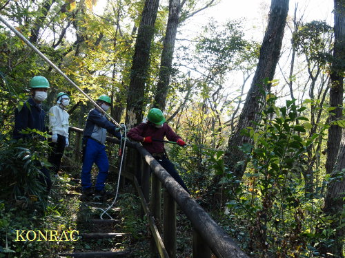 ナラ枯れが進んでいたハンノキ林東地区の伐採更新のための大径木伐採の4日目です。 当該地区のコナラは、未だ半数程が生きていますが、伐採せずに残しても、来夏以降、やがてはカシノナガキクイムシが侵入して、枯れるのは必至と考えます。 これらのコナラ以外にも、ある程度大きなイヌシデ、オオモミジがあります。 急な斜面ながら、実生の発芽は期待できそうです。 その実生を育てるためには、適度な日照が欠かせません。 小さな斜面ですので、伐採は基本的には皆伐で考えています。 勿論、伐採した樹木が萌芽更新するようであれば、それを妨げるつもりはありません。 当該斜面の上の園路から、樹木を眺めて、どれをどのように伐倒するかを話し合い、1本目の伐倒対象を決めました。 倒す方向には2本のコナラ大径木が生えていたので、その間に伐倒すれば、園路柵を壊すことなく、地面に寝かすことができると考えました。 しかも、その方向に引っ張るための支点をセットできる大径木があり、ローププーラーをセットすることができる大径木が伐採対象の直ぐ近くにありました。 大きなノコギリを引く人とローププーラーでロープを引く人が同じ画面に入ってしまう位置関係は初めてかも知れません。 そして、思った通りの方向に伐倒できました。