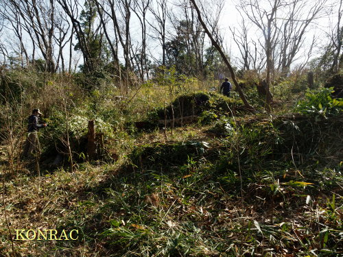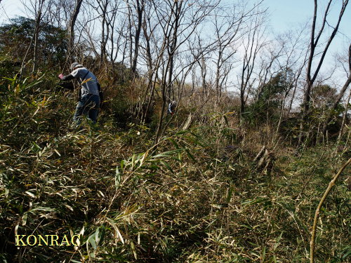 令和 4 年度第 27 回里山倶楽部 <芝生広場上雑木林のアズマネザサ刈り> 日時 2023年2月18(土) 10:00〜13:00 快晴 場所 生田緑地 芝生広場上雑木林(A09-8) 参加者 東 陽一、伊澤高行、岩渕裕輝、加登勇司、北川英樹、北澤千晴、佐藤奈緒、 野下智洋、村上忠義、吉澤正一 事務局 岩田臣生・・・11 名 芝生広場上雑木林は、ナラ枯れが始まった生田緑地において、ナラ枯れを起こさない若い雑木林をつくる目的で、伐採更新を計画した雑木林です。 伐採更新は、3年前の2020年1〜2月に高さ4mものアズマネザサのヤブを刈ることから始めました。 そして、同(2020)年10月〜翌(2021)年 3月に、また、2021年11月〜2022年 1月に、大径木を伐採しました。 その年(2022年)の夏期には、7/23(土)、9/3(土)、9/10(土)にアズマネザサ刈りを行いました。 暑くて、大変な活動でしたが、この時に刈った範囲は、ヤブにはなっておらず、夏刈りの成果だと納得しましたが、 その他の場所は、伐採した大径木を覆い隠すように、アズマネザサが茂っていました。 辺りには、アシビが開花し、ツノハシバミが雄花を見せていました。 この日は、点々とヤブをつくって広がっているアズマネザサに隠れながら、アズマネザサを刈りました。