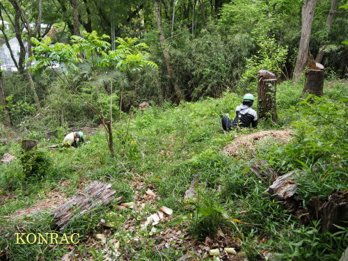 令和 5 年度第 3 回里山倶楽部 <飯室山南地区のアズマネザサ刈り、モウソウチク除伐など> 日時 2023年4月22(日) 10:00〜13:10 晴 場所 生田緑地 飯室山南地区(A14) 参加者 東 陽一、伊澤高行、岩渕裕輝、加登勇司、北川英樹、佐藤優子、野下智洋、村上忠義、 吉澤正一 事務局 岩田臣生・・・10 名 現在、生田緑地は、ナラ枯れによる危険を回避するために、幾つかの地区の通行が禁止されています。 昨年度、一応、危険木の伐採が行われたのですが、重要視されていなかったハンノキ林などは、今年度中も、アクセスできないことになっています。 木々の芽生える、気持ちの良い季節を迎えて、中央地区北側の谷戸を歩きたいという来園者も多いと思います。 ナラ枯れが起こらないように、コナラを植えない方が良いという意見も聞こえてきますが、それは、生田緑地の生物多様性を否定することに繋がりかねないと思います。 1998年末に伐採して整備しようとした萌芽更新地区での萌芽更新の失敗は、生田緑地の雑木林のコナラ・クヌギが老齢化していたためだろうと推察されます。 老齢化して、弱体化しているコナラが、カシノナガキクイムシの侵入に耐えられなかったのは止むを得ないことだと思います。 2008年は、この萌芽更新の失敗を確認した年でありますが、また、日本海側で広がっているナラ枯れについて知った年でもありました。 そして、老熟した雑木林も大切だが、若い雑木林をつくっていくことも大切であり、可能な範囲での伐採更新が必要になると確信しました。 しかし、萌芽更新地区整備の失敗は、行政仕事、つまり業者委託によってできると考えたことに問題があったと思います。 自然の保全管理には、時間がかかるということを認識しなければなりません。 仕事としてではなく、市民が楽しめる余暇活動として考えないと上手くいかないと思います。 飯室山南地区では、20m×20m の範囲の皆伐を計画し、その範囲の皆伐は北部公園事務所の予算で実施し、その後の更新管理を市民活動である里山倶楽部で行ってきました。 それは、市民活動による皆伐更新が可能か、どのように行えば更新できるか等々を探る試みでした。 この更新管理は、埋土種子から発芽した実生を育てることで、コナラ若齢林と言える雑木林をつくれることを明らかにしました。 この経験を通して、生田緑地の雑木林の林床には大量の埋土種子があることを知りました。 2014年には、皆伐更新地区の北側〜東側に隣接する雑木林に侵出しているモウソウチクの除伐を始めました。 2020年には、東側の雑木林のモウソウチクの除伐を行いながら、アズマネザサ刈りも行うようにしました。 里山倶楽部は大径木伐採も行えるようになっていたので、2022年1月には、東側隣接地の急斜面のナラ枯れ大径木伐採を行い、皆伐更新地区の拡張を試みることにしました。 このように、飯室山南地区は、皆伐更新地区を核に、斜面下方に向けて、雑木林の再生に取り組んでいます。 この日の課題は、次のようなものなので、各自の気持ちで、好きな活動をしてもらうことにしました。 @皆伐更新地区のアズマネザサ刈り 皆伐更新地区は若齢林になって、林床のアズマネザサの成長は衰えています。 A拡張区域は、昨年から発芽した実生を育てています。 実生周りのアズマネザサなどを刈ります。 B隣接雑木林のモウソウチク(筍)除伐、アズマネザサ刈り 陽当たりの良い尾根上では、コナラ実生が育っていますので、それらの周囲のアズマネザサを刈ります。