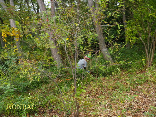 芝生広場上雑木林は、非常に魅力的な雑木林です。 アオハダがあったり、ツノハシバミがあったり、スプリング・エフェメラルと呼ばれる植物があったりして、 市有地化される前の所有者は誰で、どのような使い方をしていたのか、知りたくなります。 私たちが関わるようになった時は、倒木が散乱し、アズマネザサのヤブになっていました。 伐採更新することを決めて、来園者が自由に出入りすることを抑制するために、縁辺部は残して、内部の大木を伐採しました。 皆伐ではありませんでしたが、明るくなった林床には、次々に、コナラを始めとする多様な樹木が発芽してきました。 この日は、排除したいと思うパイオニア的樹木が大きく育っていましたので、アズマネザサ刈りと並行して、これらの除伐を行いました。 今日の活動を終了することにして、少し休憩してから、記念の集合写真を撮りました。 北川さんが 11時で帰ったのですが、集合写真を撮るのを忘れていましたので、結局、4人の集合写真になりました。