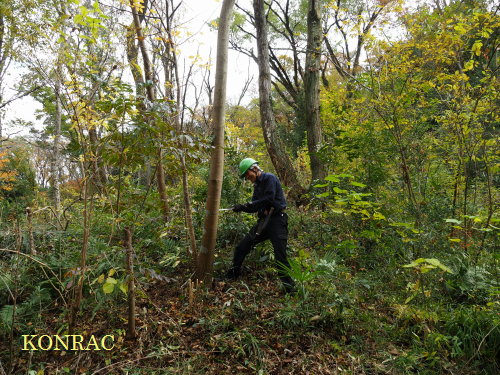 令和 5 年度第 15 回里山倶楽部 ハンノキ林東11地区の伐採更新(大径木伐採の準備) 日 時)2023年11月25(土) 9:00〜12:00 曇 場 所)生田緑地 ハンノキ林(A07-11、-01) 参加者)加登勇司 事務局)岩田臣生 計 2名 大径木伐採は、萌芽更新地区の伐採更新をやり直すことになってから行うようになりました。 今年も、いよいよ、ハンノキ林東コナラ林(A07-11)の伐採更新に着手し、11/18(土)にアズマネザサ刈りを行いました。 地形はハンノキ林東地区(A07-12)のような急傾斜地ではないので、今回、大径木伐採を始めても良かったのですが、伐採は次回からにしました。 何本も伐採してきたのに、毎年、いよいよ伐採シーズンとなると、気が重くなります。