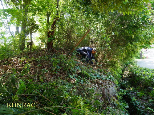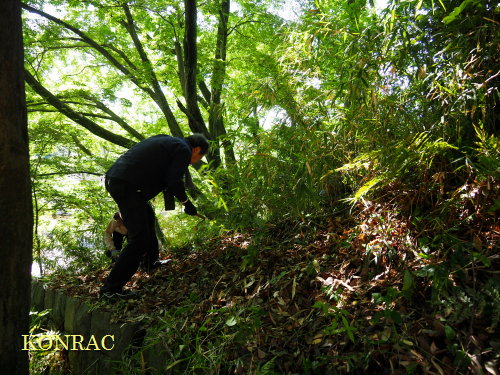 令和 6 年度第 7 回里山倶楽部 中央広場北雑木林のアズマネザサ刈り 日 時)2024年5月18(土) 9:00〜12:00 晴 場 所)生田緑地 中央広場北雑木林 参加者)加登勇司、廣瀬朗子、村上絢音(初参加)、吉澤正一 事務局)岩田臣生 参加者 5名 第7回里山倶楽部は、先週と同じ中央広場北雑木林の北端部、中央園路に面したアセビの茂み、常緑小径木の除伐などを行って、 常緑樹を減らして、林内を明るくすることを考えました。 中央広場北雑木林の目標植生は、低木層にヤマツツジが咲き、草本層にヤマユリなどが咲く雑木林(落葉広葉樹林)です。 ヤブ状態であった当該地区の植生管理を始めてから 13年が経過しましたが、北端部の中央園路沿いは余り手を入れていなかったので、植栽されたアセビが育ち、 シラカシの幼木が目立つようになっていました。 アセビは、昔、中央園路を整備した時に植栽されたものだと思いますが、落葉広葉樹林を目指している雑木林には、大きなアセビ林は必要ではないと思いました。 開花期を過ぎているので、強剪定を行ってみることにしました。 アセビ林状態の範囲も、少し小さくしたいと思いました。 また、シラカシ大木の種子散布によって、地面には、10〜20cmのシラカシ実生が一面に広がっていました。 今回は、シラカシ、クスノキなどの幼木は除伐しました。 勿論、草本層のアズマネザサも刈りました。 タマノカンアオイの群落を守るためのアズマネザサ刈りも行いました。 この雑木林は急勾配の斜面なので、林内を歩くことは、滑り落ちる危険もありますので、周囲から観察して楽しんでもらうことを考えて、植生管理を行うのが良いと思います。