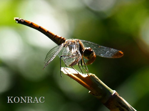 急斜面を上って、この日の活動を終わらすことにして、急斜面を上りだしたら、 刈って積んであったアズマネザサの山に、マユタテアカネ(メス)が飛来していて、秋の陽光を浴びていました。