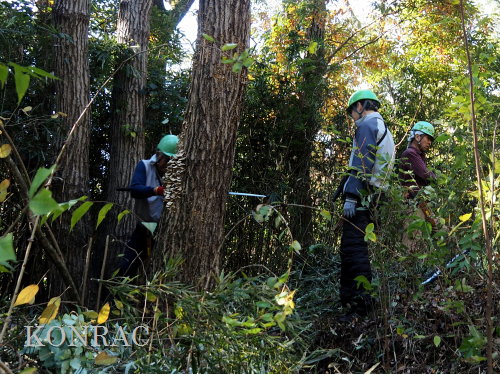 令和 6 年度第 19 回里山倶楽部 (飯室山南皆伐更新地拡張区域のナラ枯れ大径木伐採) 日 時)2024年11月30(土) 9:00〜12:00 晴 場 所)生田緑地 飯室山南皆伐更新地区拡張区域 参加者)東 陽一、伊澤高行、北川英樹、廣瀬朗子、吉澤正一 事務局)岩田臣生 参加者 6名 先週の里山倶楽部で、皆さんから、ナラ枯れコナラの伐採についての提案をいただいたので、今日は、そのナラ枯れコナラを伐採することにしました。 このコナラを伐採更新中の斜面に倒したくないので、南側のアズマネザサの茂みに倒すことを目指して、ロープを張ることにしました。 そのための障害となるアズマネザサを刈ることから、活動を始めました。
