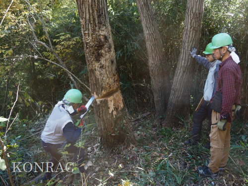 伐倒対象は、先端部に折れた枝を揺らしていました。 伐倒できずに滑車が壊れました。 1本のナラ枯れコナラの伐採を終えることができませんでしたが、今日の活動は終了して、生田緑地整備事務所裏に戻りました。