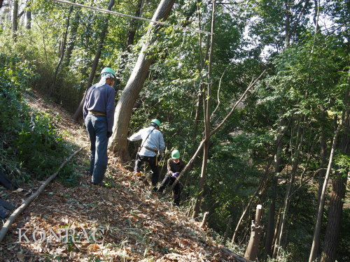 (上図)活動場所図 ここは、非常に急な斜面なのですが、1本1本の伐採対象を選び出し、 伐採方法を確認して、普段の生活では使うことのない大きなノコギリを引くことを楽しみました。 活動は安全第一ですから、斜面の下からではなく、上から、芝生広場から手を入れていきました。 前回、3本のシラカシを伐採した斜面上端部からは、太さ5〜10cmのシラカシが立ち並んでいました。 今回は、少人数の活動でしたが、ロープの結び方、ノコギリの引き方などの基本を、一つ一つ確認しながら、これらの小径木の伐採を進めました。