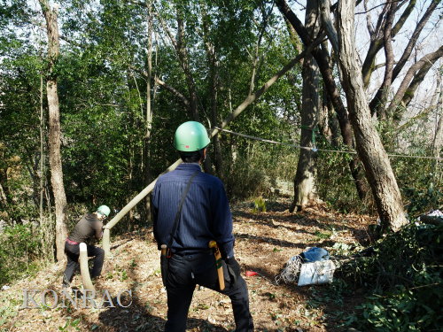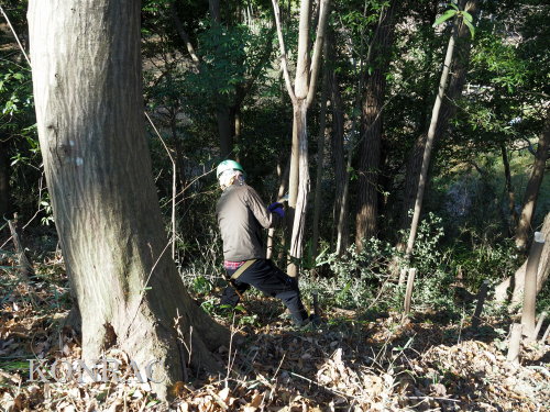 ロープで引っ張る時には、ロープ・プーラーを使いますが、今回は、そのロープ・プーラーを固定する樹木に、同じ樹木を使いました。 そして、7〜8本のシラカシを伐採しました。