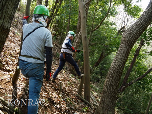 中央の大径木の伐採では、牽引するためのロープかけに手こずって、時間を取られていました。
