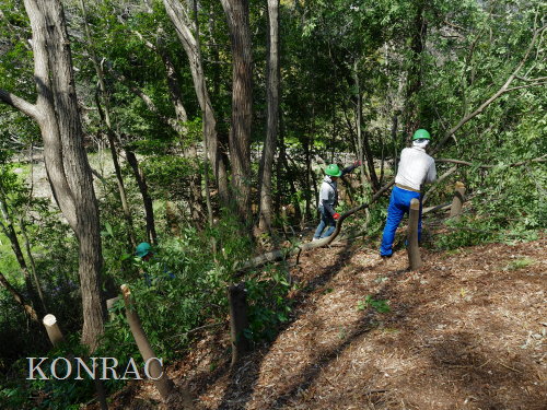 (上図)活動場所図 当該地区の常緑樹を伐採する活動も、5日目になりました。 今回は、活動3日目に伐採しかけたものの、中断していた直径20〜30cmのシラカシと、まだ、当該地区に沢山あるシラカシ小径木の伐採を行うことにしました。 次の写真の中央、斜面の下の方にあるのがシラカシの中径木ですが、これが予想外の難敵でした。 写真の右の方では、並行して、シラカシ小径木の伐採を行ないました。