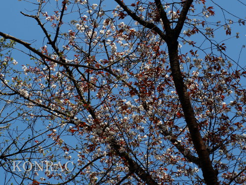 12時を過ぎたところで、この日の活動を終えることができました。 帰り道の芝生広場上雑木林の上の園路からは、伐採更新を始めた時に、枯れていると思ったものの、1本の伐採に留めて、残したサクラが開花し、 木々の芽吹きも始まって、魅力的な景観を見せてくれていました。