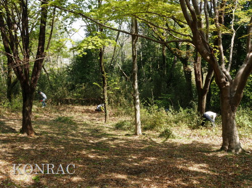 (上図)活動場所図 芝生広場は、昔は畑として利用されていたようですが、用地購入に合わせて、公園樹を植栽して、芝生広場として整備されたもので、年1回の草刈りが行われていました。 その頃は、広場の縁辺部には、かつての多摩丘陵に普通にあった在来種のフデリンドウなどが生育していました。 ところが、指定管理者制度が導入されたことで、縁辺部まで、徹底して草刈りがされるようになり、このような里山の植物の生育が危ぶまれるようになりました。 そこで、縁辺部にロープ柵を張って、そこは草刈りの対象から外してもらいました。 代わりに、私たちがアズマネザサ刈りを行わなければならないのですが、ここ数年、このアズマネザサ刈りを怠ってしまい、フデリンドウの生存が心配される状態になってしまいました。 これは拙い事態ですので、今回は里山倶楽部の活動として、芝生広場の縁辺部のアズマネザサ刈りを行うことにしました。 週末は樵という生活を楽しむようになっていた里山倶楽部のメンバーには物足りない活動だと思われたので、参加してくれるメンバーは少ないだろうと思いましたが、 常連になっていたメンバーが快く参加してくれて、パワフルな活動を展開してくれました。 お蔭で、縁辺部全域のアズマネザサ刈りは、余裕を持って、終えることができました。