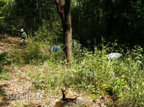 厳しい日向での活動を続けて、芝生広場下方縁辺部のロープ柵の中のアズマネザサ刈りを済ませてしまいました。