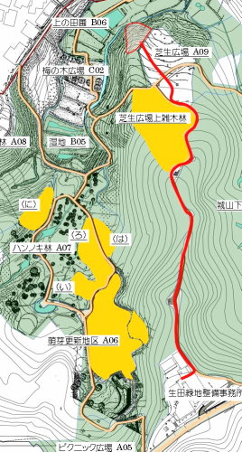 (上図)2025/11/22の活動範囲 谷戸の谷底と芝生広場との間の谷壁斜面には、コナラ、ホウノキ、ハリギリなどの落葉広葉樹に混ざって、シラカシなどの常緑広葉樹が大きく育って、繁っていました。 雑木林の遷移が進んで、常緑樹林化していたので、今年 2月22日の里山倶楽部から、シラカシの伐採を進め、今回で6回目のシラカシ除伐です。 今回は、次の写真の中央のシラカシを除伐しました。 このシラカシの下は垂直の崖で、下端は谷戸の右岸の水流になっています。 谷側には、ハリギリやコナラの大枝が両側から抱き抱えるように伸びています。 どのように伐倒するかは、4月の里山倶楽部以来、悩んでいました。 今回、改めて、現地を観察して、かかり木が少なく、かかり木があっても、その伐採が容易と思われた斜面上方向に引き倒して、引き上げることにしました。 また、ロープ・プーラーで牽引するとは言え、ロープは水平程度で引きたいと思うのですが、対象木は枝が多くて、丁度良い高さにロープをかけることが難しく、 何度も投げましたが、左右を同じ高さで縛ることが困難で、1m以上の差がある襷掛けの状態で引っ張り、伐倒することにしました。 対象のシラカシの周囲に作業するための足場が無いことも問題でしたが、対象木の根元に立って、受け口を伐り、両側に、受け口と同様の伐り込みを入れて、それから追い口を少しずつ入れて伐りました。