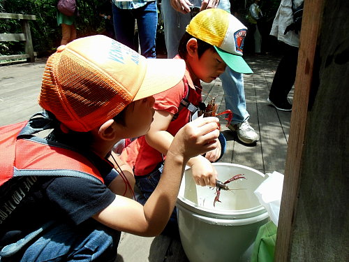 ハンノキ林上の池ではアメリカザリガニも観察しました。