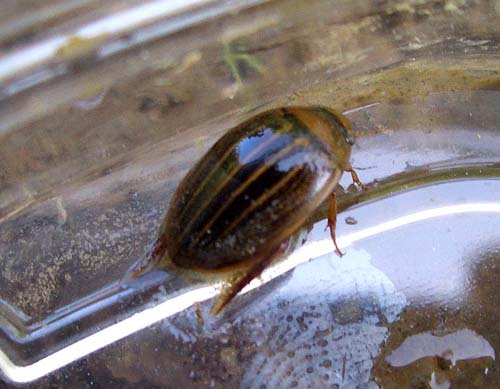 生田緑地に再生した田圃では2006年から見られるようになった。 ヒメゲンゴロウ ゲンゴロウ科 Rhantus suturalis 体長10〜12mm。北海道,本州,四国,九州,小笠原,南西諸島に分布する。 流れの緩やかな池や沼に多い。