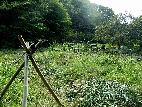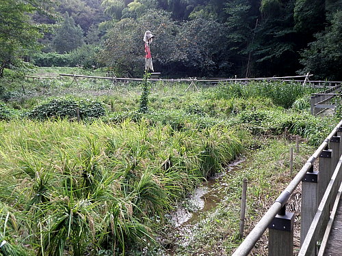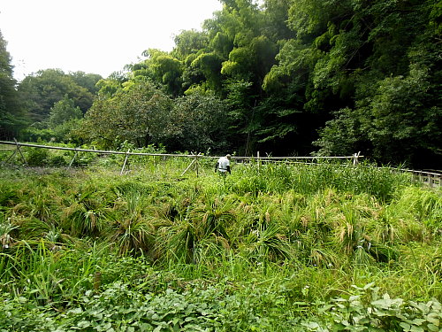 田圃周囲の草刈りなど 日時 2013/10/3(木) 10:00〜13:00 晴 場所 生田緑地 田圃 参加者 岩田臣生、岩田芳美、鈴木潤三 オニヤンマが田圃の周りを低く飛んでいました。