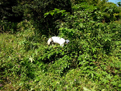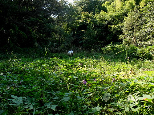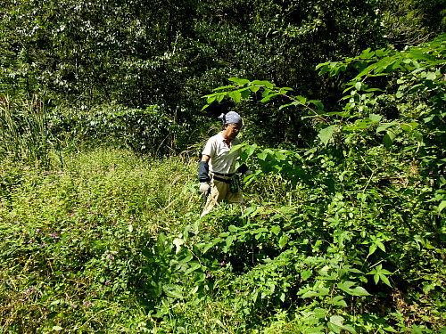 ヤマグワ等の除伐、ススキ、カナムグラ等の刈り取り、水流の管理 日時 2013/10/12(土) 10:30〜14:00 晴 場所 生田緑地 湿地 参加者 岩田臣生、岩田芳美 湿地の手入れを始めることにしました。 しかし、真夏の陽気に作業は捗りません。 水路の流れが途中で消えていました。 ジョレンを持って来なかったので、足で踏んで、穴を塞ぎました。 今年は、改めて、全流程を改修する必要がありそうです。 ツゲ、ヤマグワ、ウツギ、ヤマザクラ、モミジなど畦に生えていた実生を伐りながら、下草を刈りましたが、 10m程の範囲しかできませんでした。 ススキの下にはアザミやゲンノショウコが咲いていました。