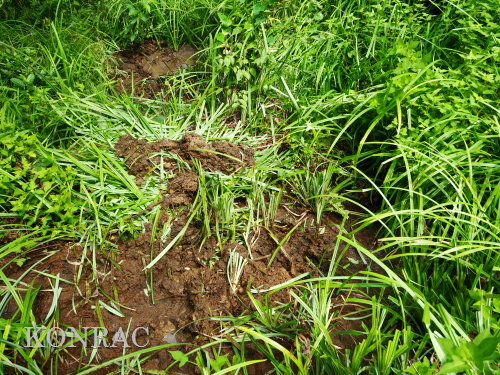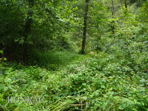 谷戸の水辺保全 日 時)9月23日(火) 9:00〜12:00 晴 場 所)生田緑地 ハンノキ林(A07-03) 活動者)岩田臣生 今朝は、青空にうろこ雲がゆっくり流れていました。 ハンノキ林東側地区(A07-12)の斜面下の水流の落枝ダムつくりを行うつもりで、ハンノキ林上の池付近から入って、ヤブ刈りをしながら、目的地に向かいました。 ハンノキ林には、ヤマホトトギス、ツルニンジン、ツリフネソウなどが咲いていました。 ![]() ![]() ![]() 萌芽更新地区北側を源頭部とする谷に、9/13(土)に掘った穴には、水が溢れていました。 相変わらず、5〜6匹のオオスズメが出入りしていました。 ![]() 9:33 暑さ指数 20.8℃、周囲温度 24.8℃、湿度 59.2% 伐採して倒してあったナラ枯れ大径木は、地面から少し浮いていましたが、川幅としては狭くなっている場所だと判断し、堰を設ける場所にしました。 まず、この材の際に溝を掘りました。 上の方は黄褐色の土で、その下が緑灰色の飯室層混じりの土でした。 斜面を見上げると、伐採しなかったオオモミジの大木がありました。 ![]() ![]() それから、その辺りのミヤマシラスゲを刈りました。 次に、水路になるように溝を掘って、掘った土砂を使って土嚢をつくりました。 水辺保全としての泥上げは毎年実施していたはずなのですが、何年も放置していたように、しまった土砂が堆積していました。 土嚢に使う土砂は、ここに溜まっていた土砂を使いました。 ![]() 土嚢を4袋つくって、先程、材の際に掘った溝に並べました。 土砂を取るために掘った溝には、僅かずつですが、水が染み出していました。 ![]() ![]() ここから、先程確認した源頭部の水面までの間は、10m以上ありそうです。 土嚢堰の高さについては、この溝を広げて行って、水面が広がって、この土嚢を越水するようになってから考えることにします。 ![]() 水流の水面が広がっていない原因が、降雨不足ばかりではなく、泥上げができていなかったことも大きいと分かったので、 辺りの水辺も少し調べて歩きました。 ナラ枯れや東側斜面の伐採更新によって、明るくなったことで、ミヤマシラスゲが繁茂してしまったため、泥上げも容易にできなくなっていたようです。 ![]() ![]() この日の活動を終了しようと思って、土嚢堰を見ましたが、水は殆ど増えていませんでした 今後の水辺保全については、ゆっくり考えたいと思います。 ![]() 盛期を迎えたツリフネソウには、キンケハラナガツチバチ?が吸蜜に来ていました。 ![]() 合流部には、ジョロウグモが巣を張っていました。 ![]() 合流部のウメモドキの実が紅くなっていました。 ![]() |