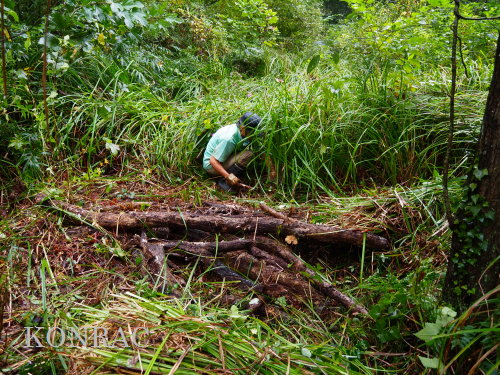 田村さんには、ハンノキ林東地区(A07-11)の斜面下の草刈りをお願いしました。 03、05、06は、ハンノキ林東地区(A07-11)の斜面下を流れる水と、01、04、02から流れて来る水の合流する場所です。 01〜03の水辺再生イメージができてきたので、こちら側の状態を調べることにして、草刈りを行いました。 ハンノキ林東地区(A07-11)のナラ枯れ大径木伐採時に、ここを通るために置いた材や、玉切りした伐採材などが転がっています。