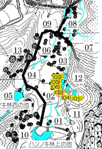 ハンノキ林の水辺再生 日 時)10月16日(木) 9:00〜12:00 雨 場 所)生田緑地 ハンノキ林(A07-02) 活動者)岩田臣生、田村成美 今回も、ピクニック広場東階段に落ちた倒木を避けて、ハンノキ林に向かいました。 活動は前回の続きで、場所はハンノキ林(A07-02)です。 今までに、6ヶ所に、水が見られる深さ(40〜70cm)までの穴を掘ってきました。 前回まで、それらの水位は殆ど変化がありませんでしたが、今回は、04の穴では、深さの60〜70%まで水位が上がっていました。 勿論、01も水が回復していましたので、生田緑地の水涸れが納まってきたと感じました。 これは、小雨の降る中の作業だったことの影響もあるかも知れませんが、どの穴も、少しながら水深が深くなってきたと思います。 これで、水辺再生の可能性は高まったと思いました。