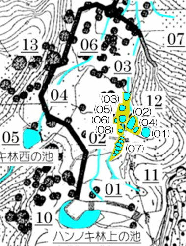03、05、06の辺りの平坦な場所の水溜まり穴の水位に変化は感じられませんでした。 02の水溜まり穴を少し広げてみましたが、水深に変化があったわけではないので止めました。 湧水量が増えていると感じさせてくれる現象が見つかりません。 |