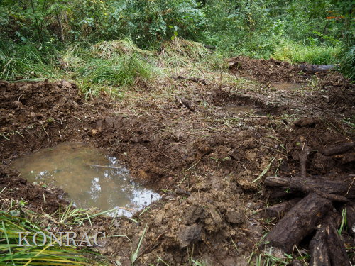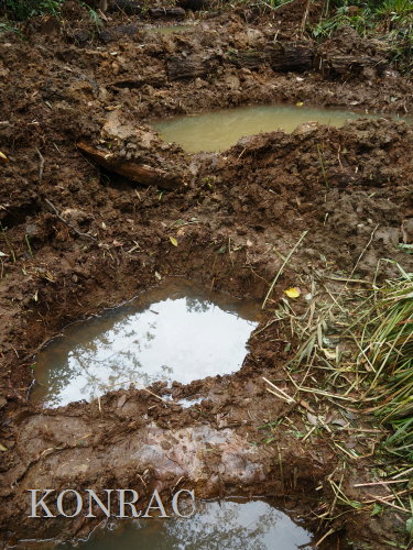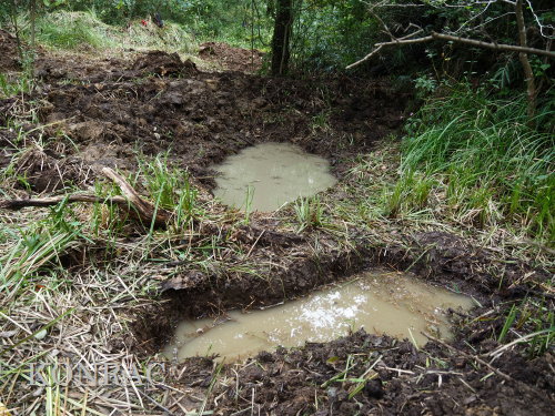 一昨日、10/21(火)に、里山倶楽部で掘った穴の末端と水溜まり穴06との間に掘った穴には、たっぶりと水が溜まっていました。