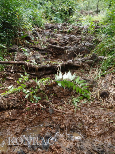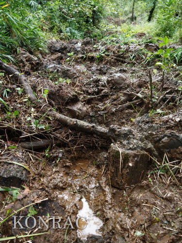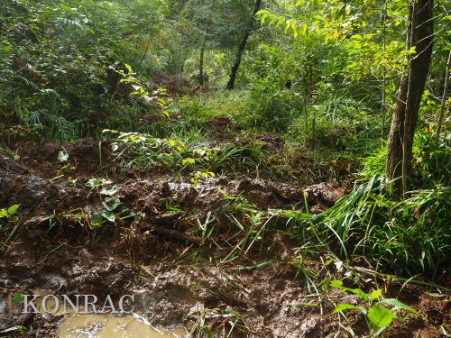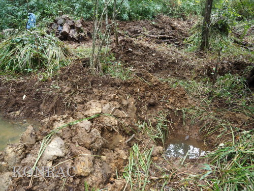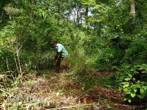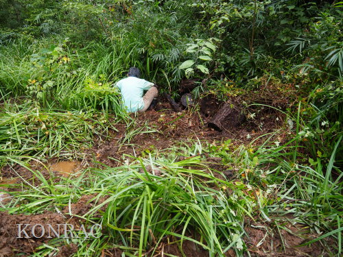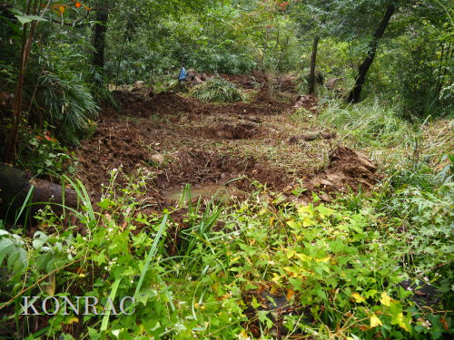 昨日の雨によって、この辺りの地下水位が上がってきたようです。 地下の飯室層の上の砂礫層に水が流れているようで、どこでも、穴を掘れば、水が溜まるようになりました。 この日は、水溜まり穴03の北側のミヤマシラスゲやミゾソバが繁る水流跡の泥上げを行って、階段状の水路を露わにしていきました。 残念ながら、木道まで届きませんでしたが、ミヤマシラスゲなどの根が邪魔することを除けば、水は平常時の水流の泥上げと同じような状態になっていました。