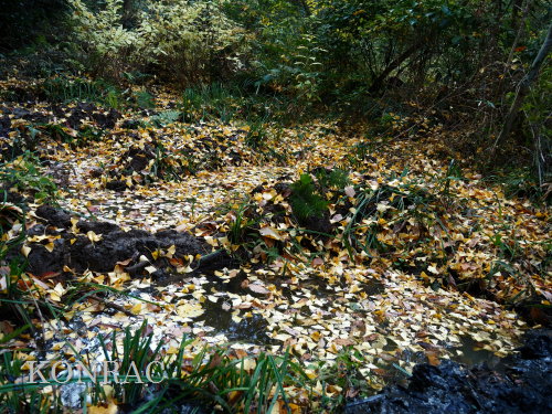 (上図)11/27(木)の活動場所図 11/27(木)に泥上げを行った場所には水面が広がり、黄葉の落葉が浮かんでいました。 この日は、その下流の泥の上に落葉が広がっている所に、水溜まり穴を掘って、泥上げを行いました。