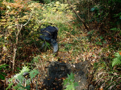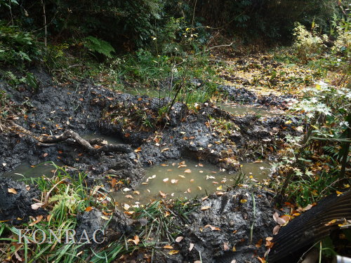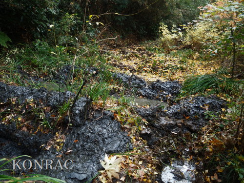 泥面と言っても、足を踏み入れれば、ズボッと潜るような柔らかい泥溜まりです。 周囲の草木、枯枝、落枝などを積んで、その上に、泥を上げて、堰をつくることで、水溜まり穴をつくります。 そこに水が溜まるまでには時間がかかりますので、後は自然に任せます。